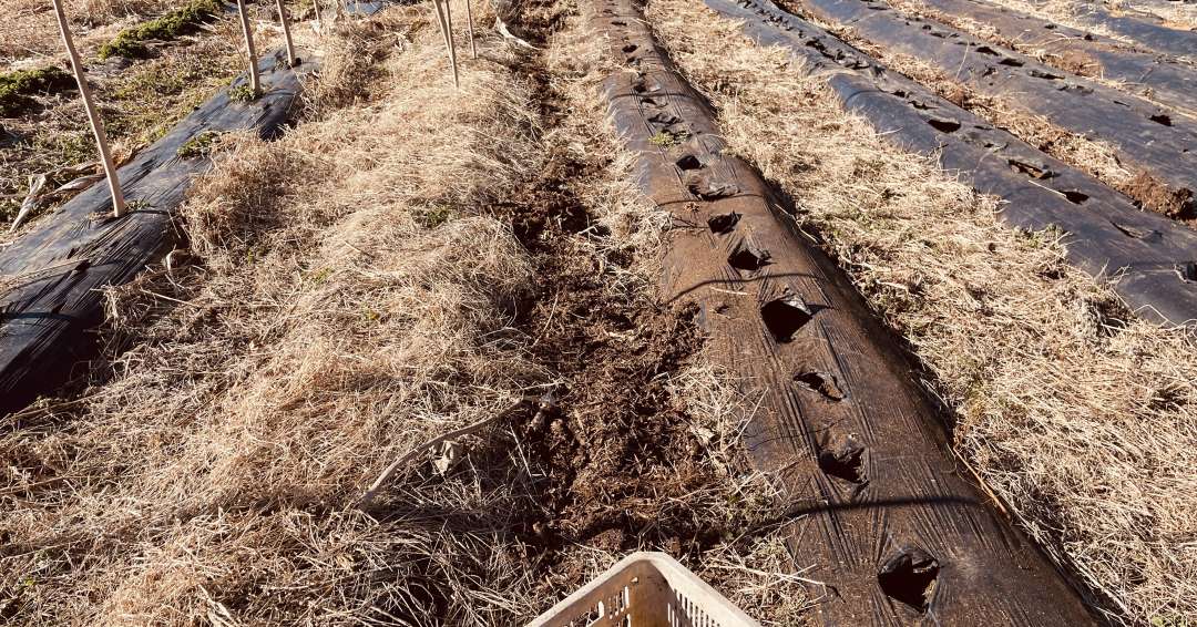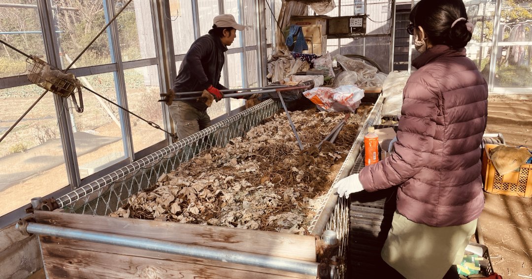 今回の作業は、「踏み込み温床」の片付けと再利用でした。 温床とは、落ち葉やウッドチップ、米ぬかを10層ほどミルフィーユ状に重ねて、みんなで踏み固めて作る天然の床暖房のこと。微生物がこれらを分解する時に出す「発酵熱」を利用して、寒い時期に苗を育てます。