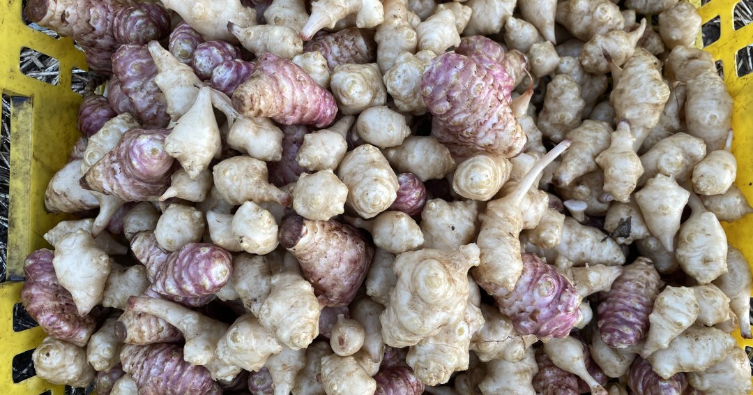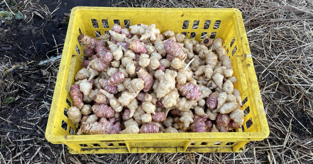 - 菊芋の宝探し: 紫色の赤菊芋に、小ぶりな白菊芋。スコップで掘り起こした後、手探りで土をかき分けると、宝探しのようにゴロゴロと芋が出てきます。夢中で手を動かしているうちに、あっという間にケースがいっぱいになりました。
