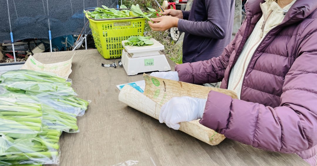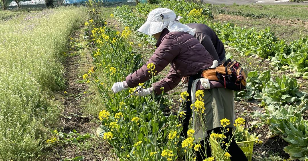 まずは菜の花の収穫とパッキングから始まりました。黄色の花びらが春の陽光を浴びてキラキラと輝く様子は、見ているだけで心が明るくなります。一つひとつ丁寧に摘み取り、袋に詰めていく作業は、とても爽やかな気持ちになれる時間でした。