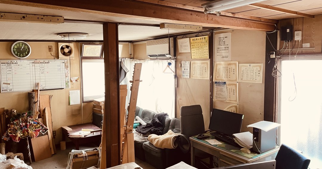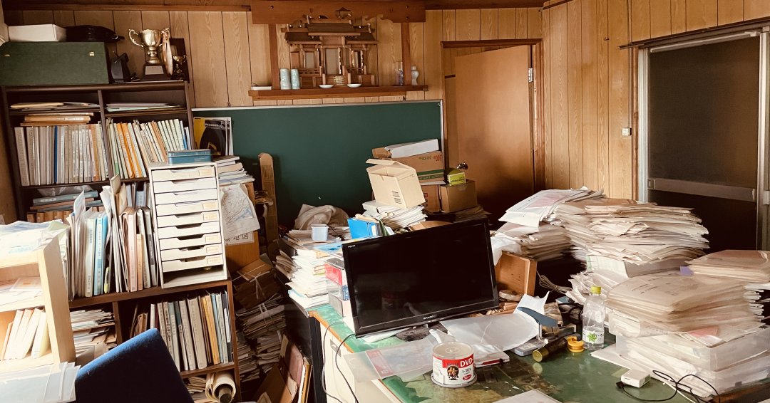 場所は原付バイクで40分ほどの距離にあります。もともとは会社の事務所として使われていた建物で、大きな事務机や書類棚、そして大量の書類がそのまま残されていました。正直なところ、最初に見たときは「これを本当に工房にできるのだろうか」という不安もありました。