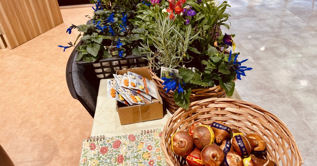 ハロウィンを意識したかぼちゃのフラワーピックや、春に咲くチューリップの球根をプレゼントし、テーブルは色とりどりに。
