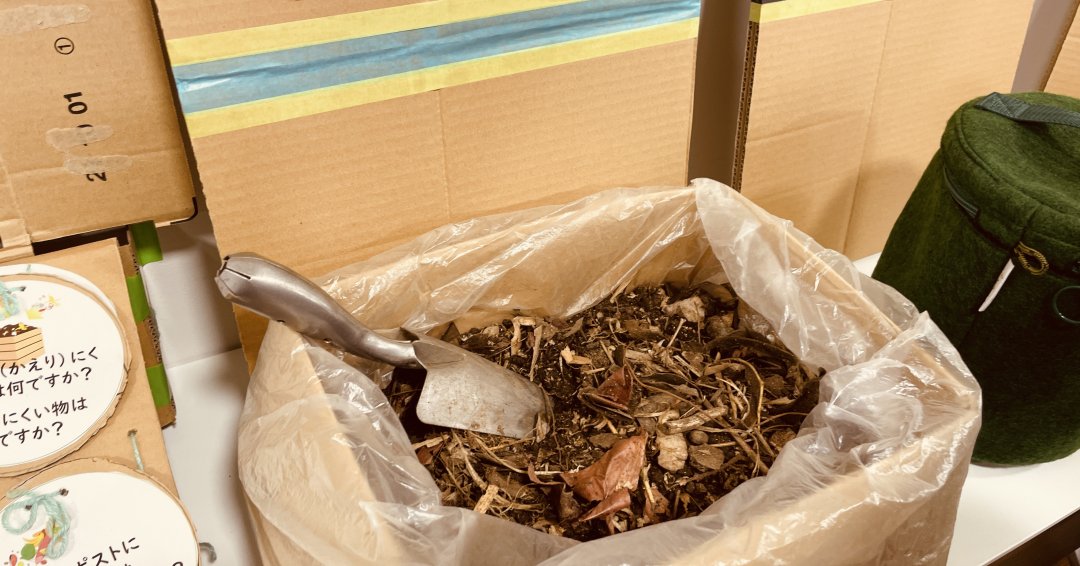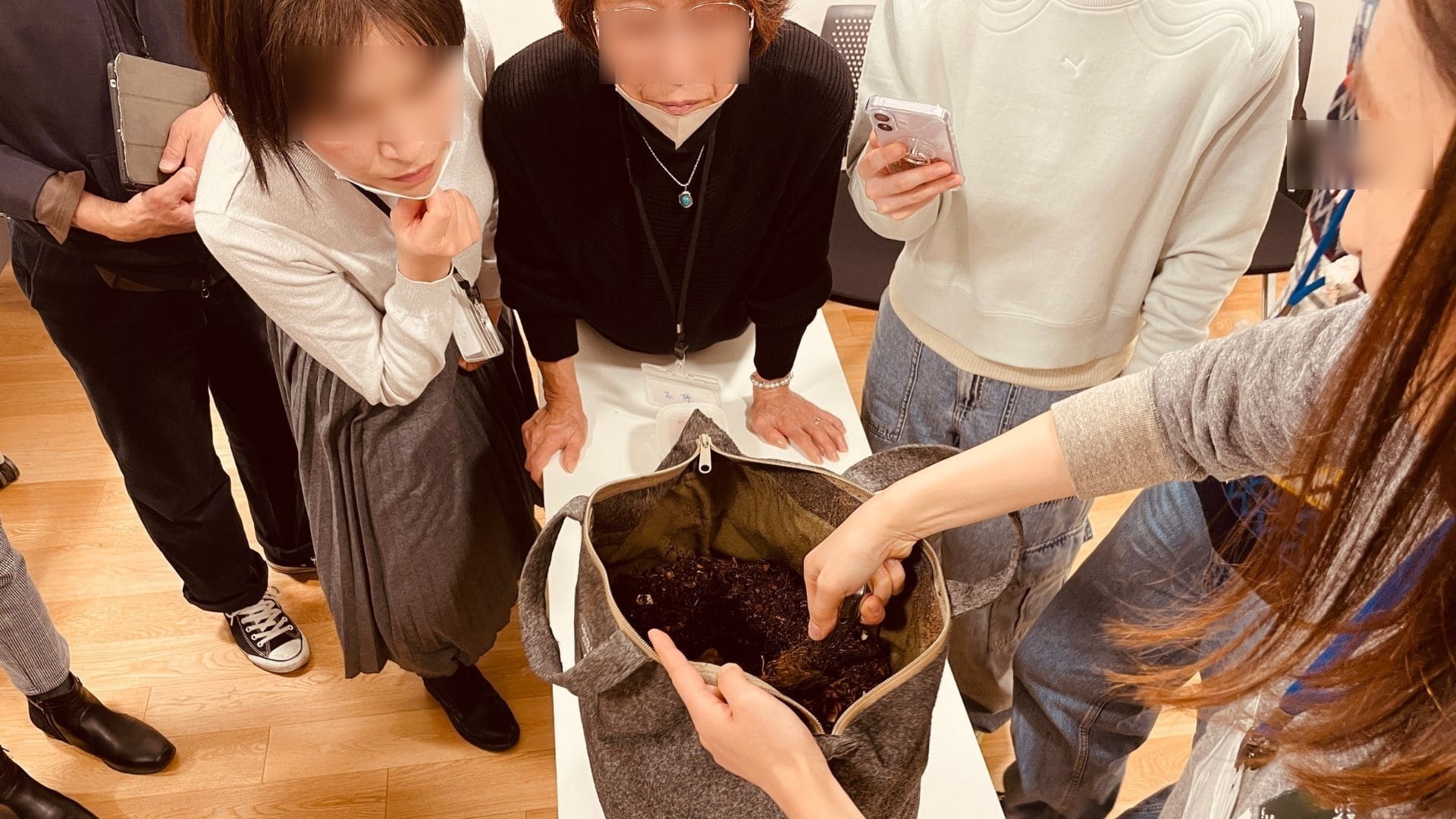 実際にバッグを開けて、専用の基材(チップ状の土台)の説明を受けます。生ごみを入れてかき混ぜるだけで、微生物が分解してくれる仕組み。臭いも少なく、虫も湧きにくい工夫がされていて、都市部での暮らしでも無理なく続けられそうだと感じました。