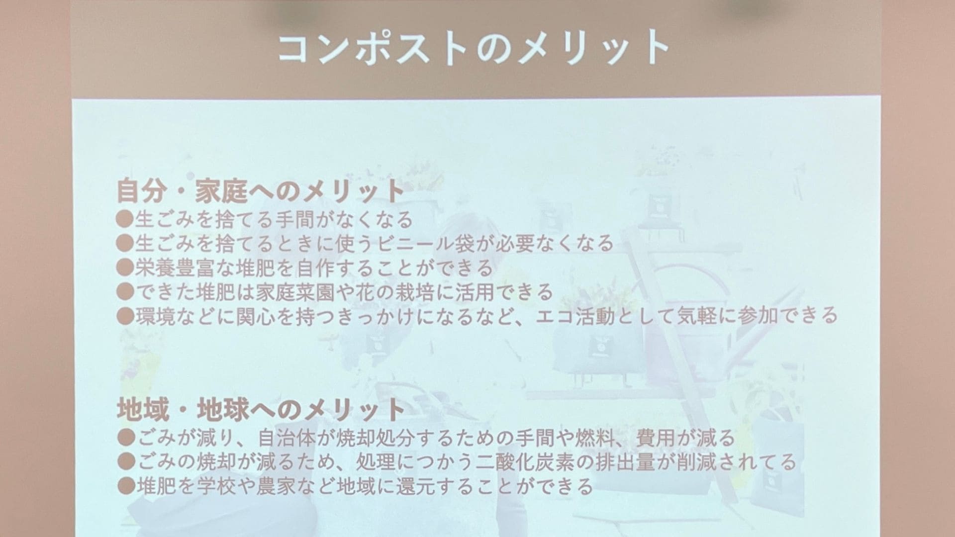 今回の講座で一番感じたのは、「生ごみゼロ生活は特別なことじゃない」ということです。プランターでも、バッグ型コンポストでも、自分の暮らしに合った方法で今日から始められる。そして何より、1人当たり年間1.9万円分のフードロスという事実を知り、これは家計にも環境にも優しい選択なんだと実感しました。