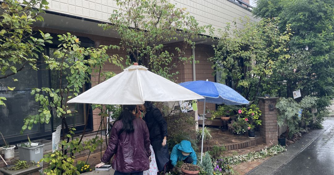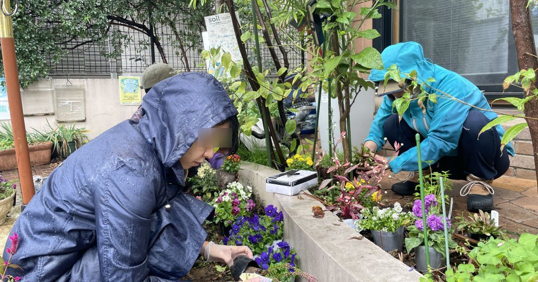 雨音の中で土を触り、草を抜き、花の位置を考えながら語らう時間。