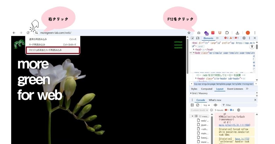 F12→『↻』を右クリック→「キャッシュの消去とハード再読み込み」
