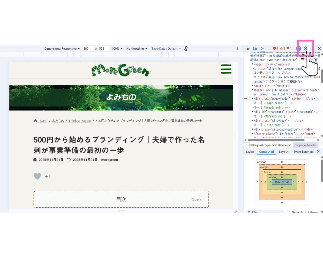 Google Chromeで自分のサイトを開く → 『F12』(※Mac:Command + Option + I)キーを押す