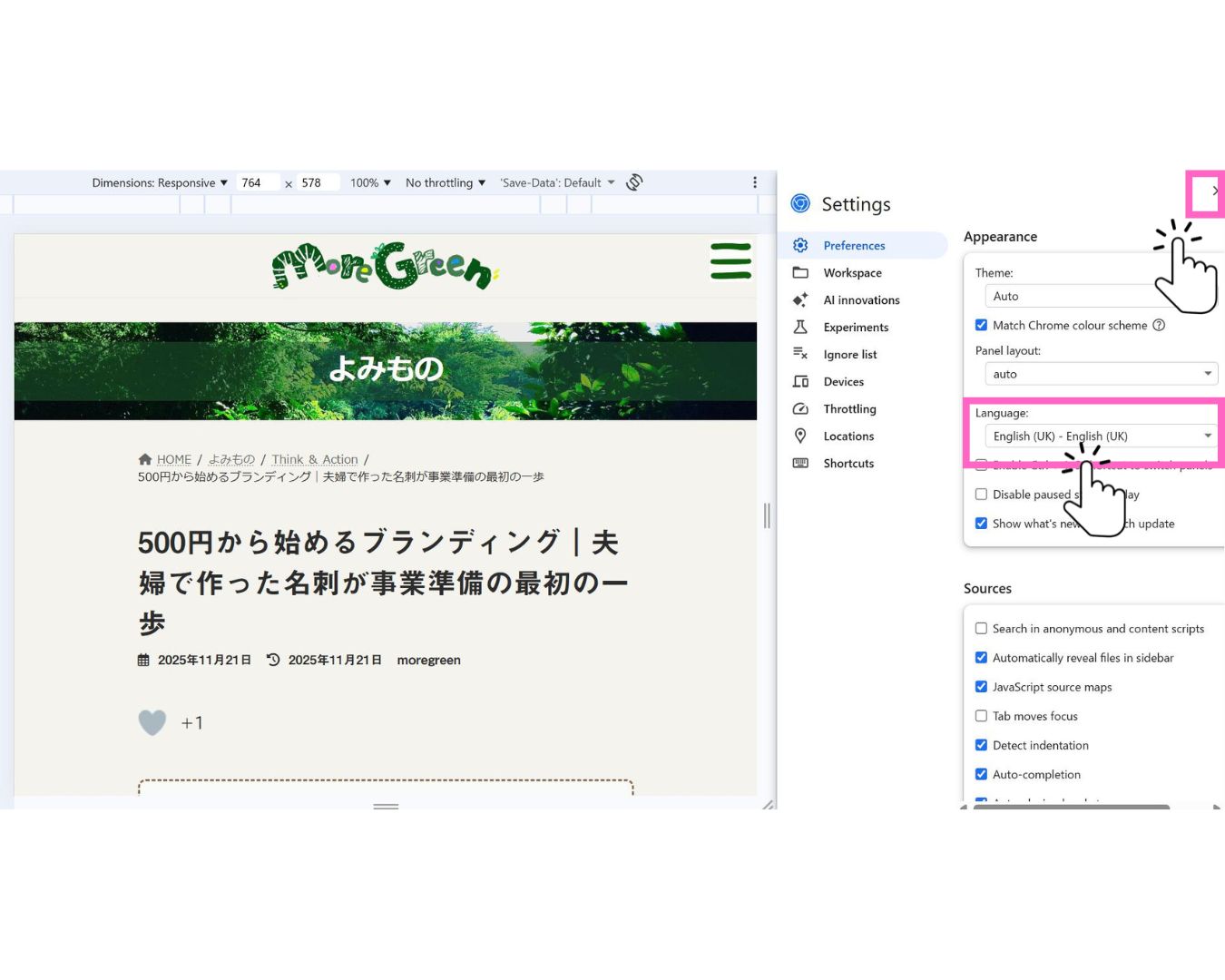 右上の「トグルマーク(設定)」→「Language」で日本語を選択→「×」で設定を閉じる→「Reload Dev Tools(青いボタン)」で言語を変更できます。英語が苦手でも安心です。