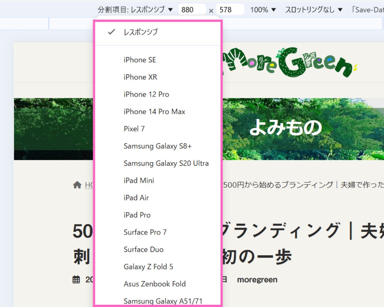 ツール上部の「分割項目:レスポンシブ」部分をクリック → プルダウンで選択すると、スマホ表示やタブレット表示を疑似的に再現できます。