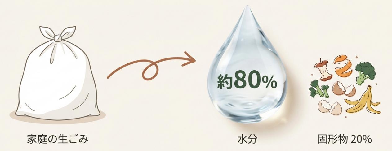 実は、私たちが捨てている生ごみの約80%は「水分」です。