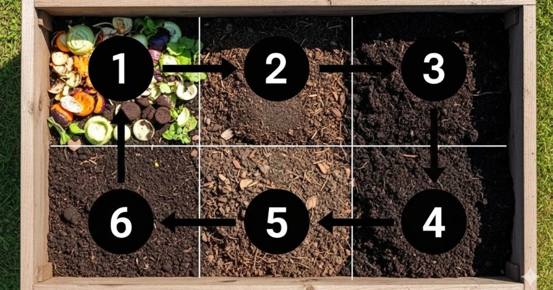 図のように、ブロックに区切って、間隔を空けて被らないように生ごみを埋めてあげましょう。